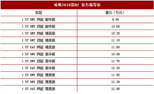 2016款哈弗H2在外观内饰方面并没有明显变化,而在配置方面则有所升级。根据不同车款增加了电子手刹、雾灯带转向辅助照明、车身稳定控制系统(豪华型、尊贵型标配)、电动天窗、电动折叠外后视镜、坡道辅助等14项配置。