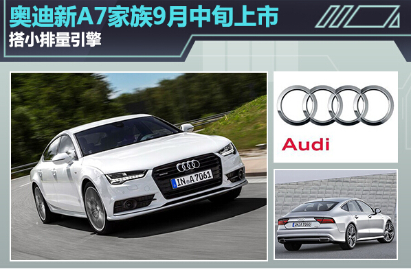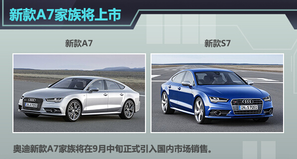 奥迪A7是一款定位介于C级行政/公务和D级豪华轿车之间的四门运动豪华Coupe轿跑车,尺寸上略大于没有加长过的C级行政轿车,小于D级豪华轿车。此前奥迪发布了旗下中期改款A7系 列车型,新车最大的亮点在于采用了该品牌最新研发的矩阵式LED头灯,同时全新的灯组造型让新车更具运动感。近日,我们从奥迪官方了解到,新款A7家族 (A7和S7)将在9月中旬正式在华上市,除外观的变化外,新车型采用了排量更低的1.8T发动机作为入门动力配置,也有望使价格门槛进一步降低。