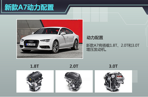在动力方面,新款A7除搭载3.0L机械增压发动机外,还将新增1.8T和2.0T两款涡轮增压发动机,以取代现款车型所采用的2.5L和2.8L两款自然吸气发动机,并与之匹配了7速双离合变速器。动力配置的改变除将进一步提升新款A7的燃油经济性外,由于排量的下降还将使新车型所需缴纳的消费税有所降低。