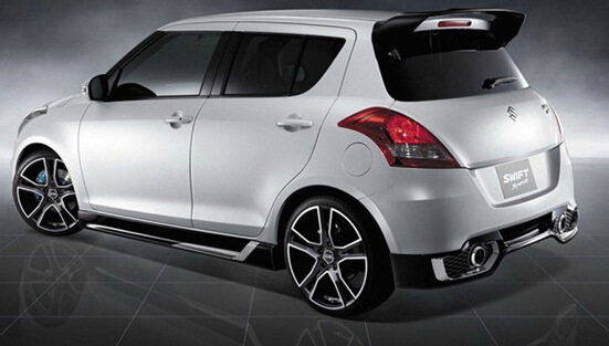 在车型外观方面,速翼特Sport概念车尾门上方装配有大尺寸扰流板,同时具有双边共两出的排气布局,排气管集成在车尾包围中,车身侧面可以看到其配备了侧部包围和大尺寸五辐轮圈。