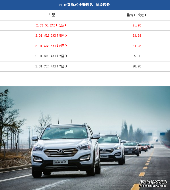近日,现代2015款全新胜达,目前购车最高可享受8万元优惠,购车成功即送价值万元汽车装饰...[详细]