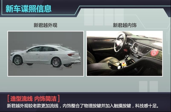 通过谍照可以看出,新君越相比现款车型侧面造型变化较大,后门三角窗由现款车门部位移至车体C柱,后座视野较现款将有所改观,侧面线条更加流畅。尾部采用鸭尾式设计,整体运动感更强,尾灯或采用类似威朗的新一代家族设计,较现款更加修长。内饰部分变化同样较大,环抱式设计更为突出,出风口造型设计更加贴合内饰整体风格,触摸屏较现款尺寸加大,并且在周边加入触摸式按键。物理按键的减少使得整体内饰较现款更为整洁。此外,新车的换挡杆设计更加运动,极富科技感。