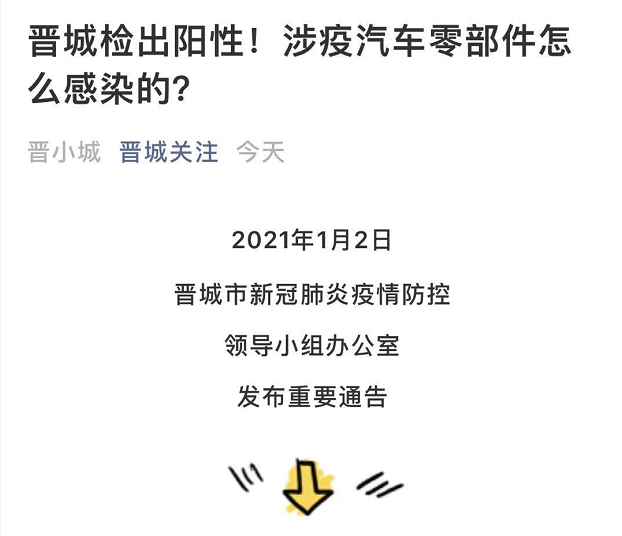 晋城疫情防控指挥部通报,2021年1月1日,晋城市城区疾控中心在对国内某涉疫企业输入晋城市的汽车配件货品进行排查时,抽样送检的汽车轮胎外包装样本新冠病毒核酸检测结果呈阳性。