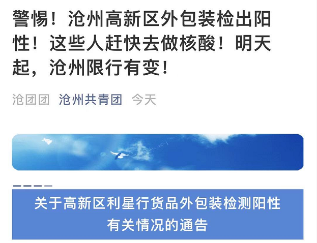 据沧州共青团发布,沧州高新区接到有关单位推送的重点货品协查函,立即组织有关部门对高新区利星行汽车销售服务有限公司该批货品及其接触人员进行核酸检测。经检测,其中1个零配件外包装样本检测结果呈阳性,其余样本均为阴性;所有接触人员样本检测结果均为阴性。