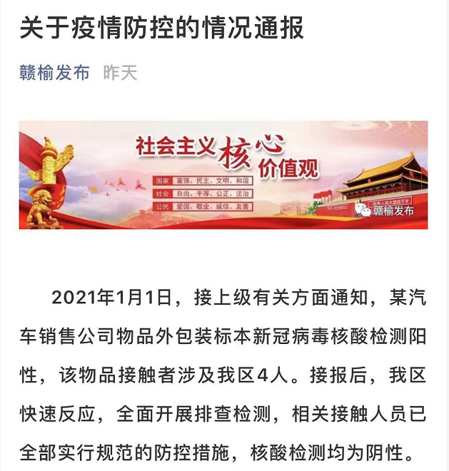 连云港赣榆区卫生健康委员会通报,2021年1月1日,接上级有关方面通知,某汽车销售公司物品外包装标本新冠病毒核酸检测阳性,该物品接触者涉及赣榆区4人。相关接触人员已全部实行规范的防控措施,核酸检测均为阴性。