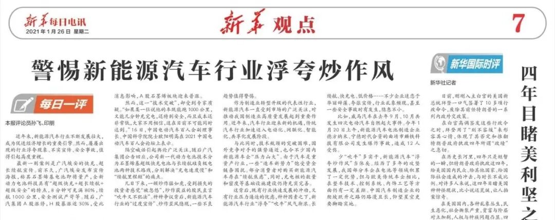 在新能源汽车快速发展的背景下,却屡屡出现产品安全、过度宣传、虚假宣传等行为。1月26日,新华社的一篇评论文章引起关注,标题为“警惕新能源汽车行业浮夸炒作风”,其公开点名几家新能源企业,文章内容指出“新能源汽车行业的“过度宣传”、炒作歪风隐现,一些不良趋势值得警惕”。