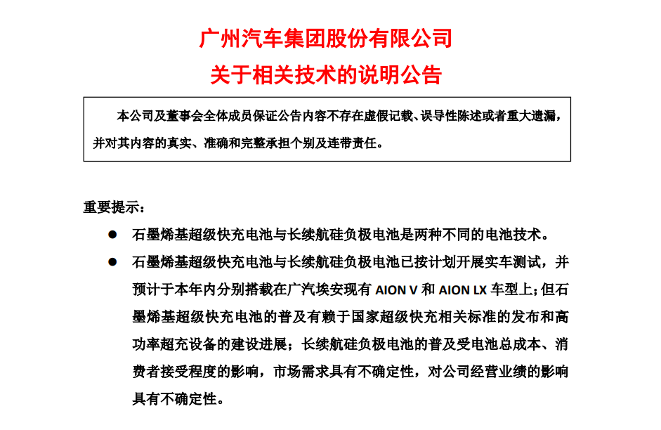 1月15日,广汽埃安发布的一张宣传海报显示,其最新动力电池科技具有超级快充、超级续航、超级安全的优点。其宣称采用的石墨烯基超级快充电池具有“超级快充+超长续航+超级安全”的特点,8分钟可充满80%,续航1000公里,拥有史上最严苛的安全测试,新电池即将实现量产。该消息一出,当日广汽集团A股涨停,H股收盘报涨19.49%。