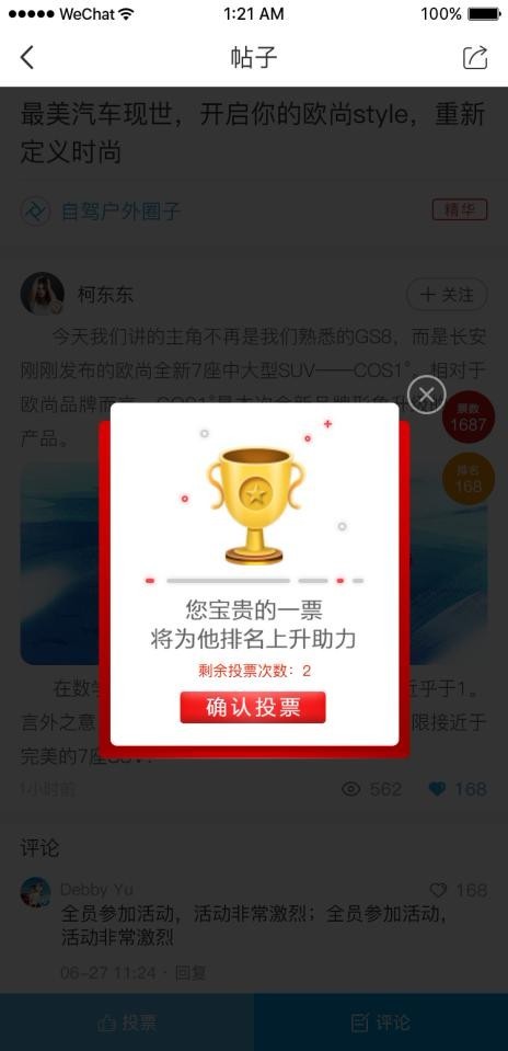 为了体现公平性,本次小视频挑战赛的评比采用的是内外部公开投票的方式,8月2日至8月6日活动期间,参与用户可以邀请好友对自己所发布的小视频作品进行投票。欧尚Style App根据最后的票数排名,将会发放最高5000元的油卡或者等值京东卡奖励。