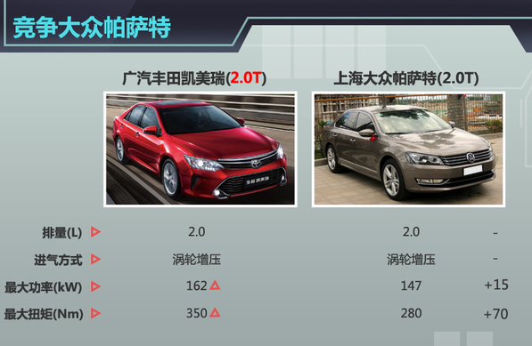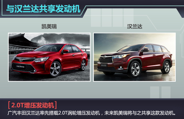 丰田凯美瑞搭载2.0L和2.5L两款自然吸气发动机,该车2015年上半年累计销量接近7万台,是B级轿车细分市场的标杆车型。日前,我们了解到:未来凯美瑞将搭载2.0T涡轮增压发动机。目前广汽丰田汉兰达已经搭载2.0T增压发动机,凯美瑞有望与之共享动力系统,届时广汽丰田凯美瑞将与同样搭载2.0T发动机的上海大众帕萨特展开更为直接的竞争。