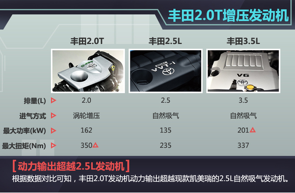 丰田2.0T涡轮增压发动机最大功率162kW,最大扭矩350Nm,通过与广汽丰田现款凯美瑞搭载的2.5L自然吸气发动机进行数据对比可以发现,2.0T增压发动机在最大功率和最大扭矩两方面全面超越2.5L发动机,即使与排量更大的丰田3.5L发动机相比,2.0T发动机在最大扭矩方面仍然具有优势。