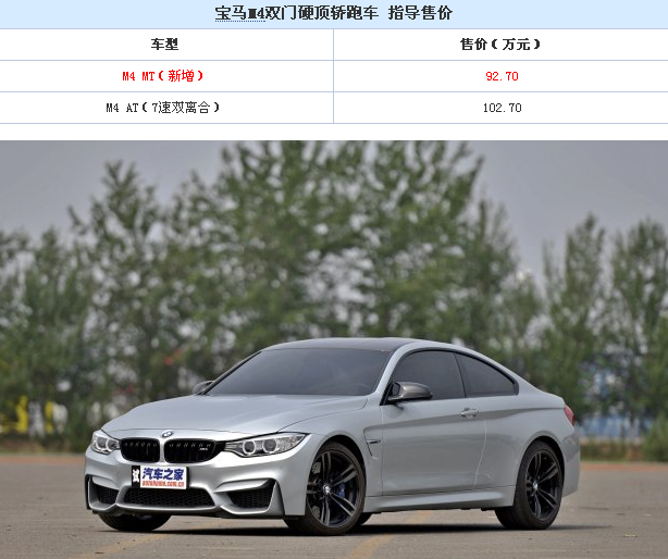 近日,我们从宝马中国官方网站获悉,M4增添了一款M4双门硬顶轿跑车MT版本,售价为92.7万,相比2014年10月推出的M4马年限量版(仅限量10台,使用MT变速箱)价格便宜了4.9万元。